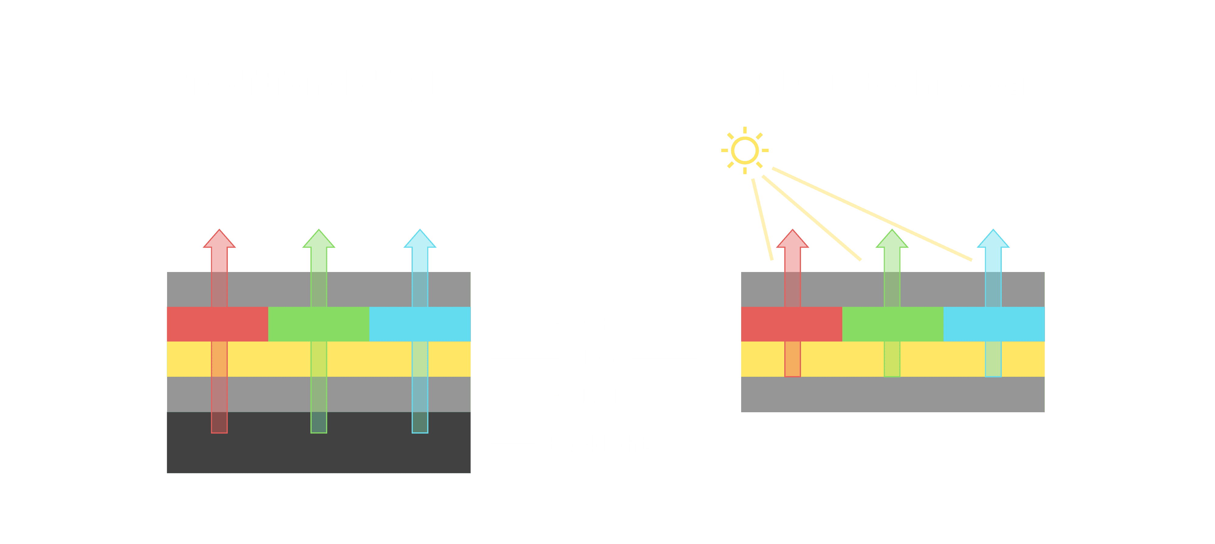 与传统需搭配背光单元的液晶显示相比,,反射式液晶技术不仅更省电、、、更轻薄,,,且即便在艳阳下仍能清晰显示。。。。此外,,少了背光单元,,,也大幅降低了 LED 蓝光伤害眼睛的疑虑。。。。