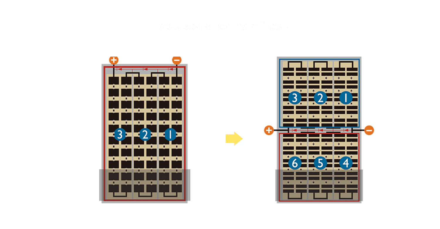 - 电池使用多条铜导线 (Copper wire) 于电池片上形成较短的电流路径,,,,提高电流收集效率,,采用圆形设计的铜导线较传统扁平式的铜焊带 (Ribbon),,,,可增加入射至电池的光线量。。